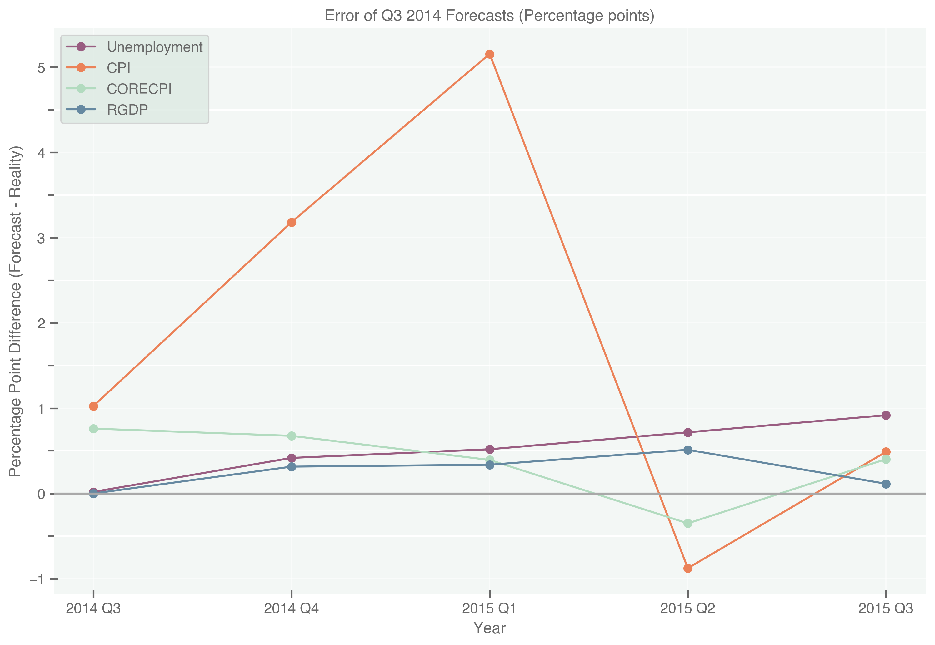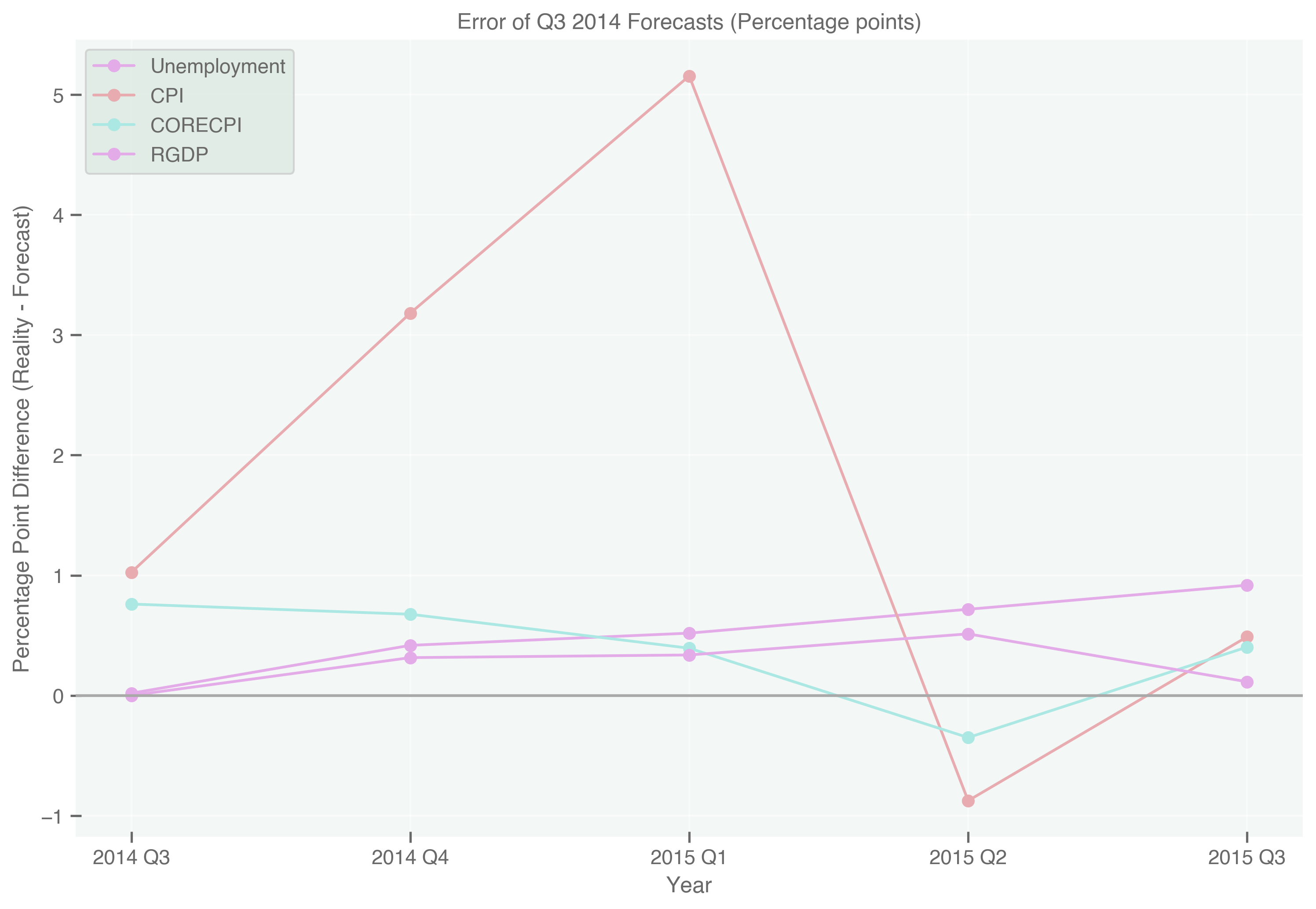 ax.set(title='Error of Q3 2014 Forecasts (Percentage points)',